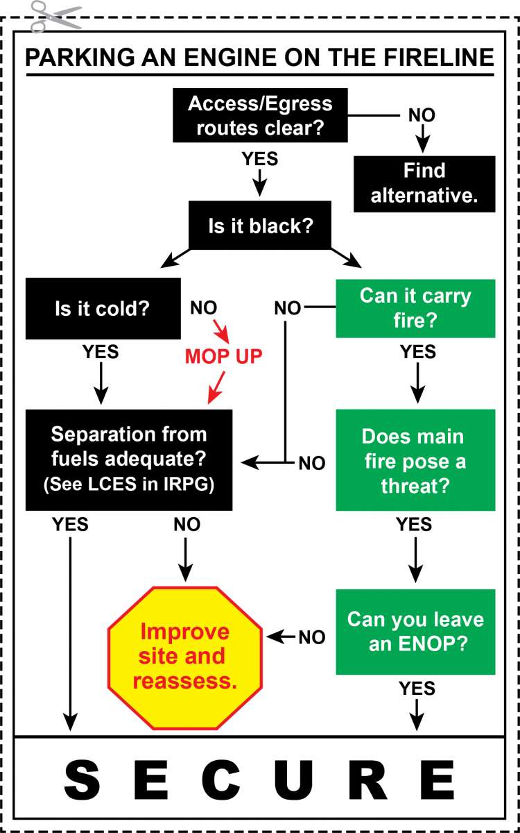 When fighting wildland fire, there are occasions when crews must leave their engines and equipment to implement suppression tactics. In doing so, fire equipment remains the responsibility of all crew members and its safety must be seen to. In the heat of the moment, with pressures to get to work, it can be hard to remember to pause and think about things like where we park our vehicles.