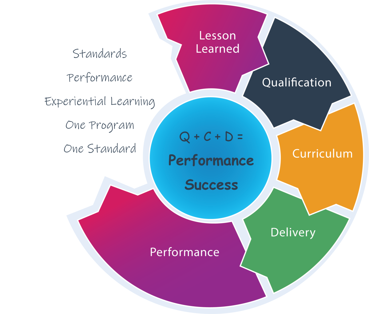 Infograph describing formula for performance success is the result of lessons learned plus qualification plus curriculum plus delivery.
