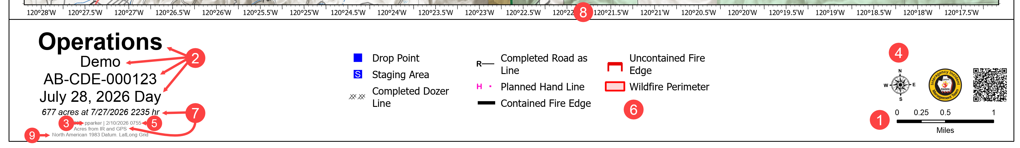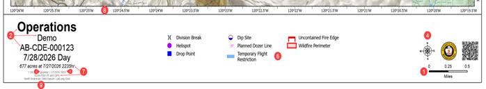 • Title (2): The basic description of the map, including items such as incident name and map type. The Unit Identifier and the Local Incident Identifier are included (e.g., ID-BOF-0095). For certain maps, the title must also include the operation date and/or period for which the map was produced.