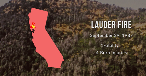 The Lauder Fire occurred on September 29, 1987 in the coast range mountains of north western California. The combination of dense fuel loading, poor communication, and human factors resulted in 1 firefighter fatality and 4 burn injuries.
